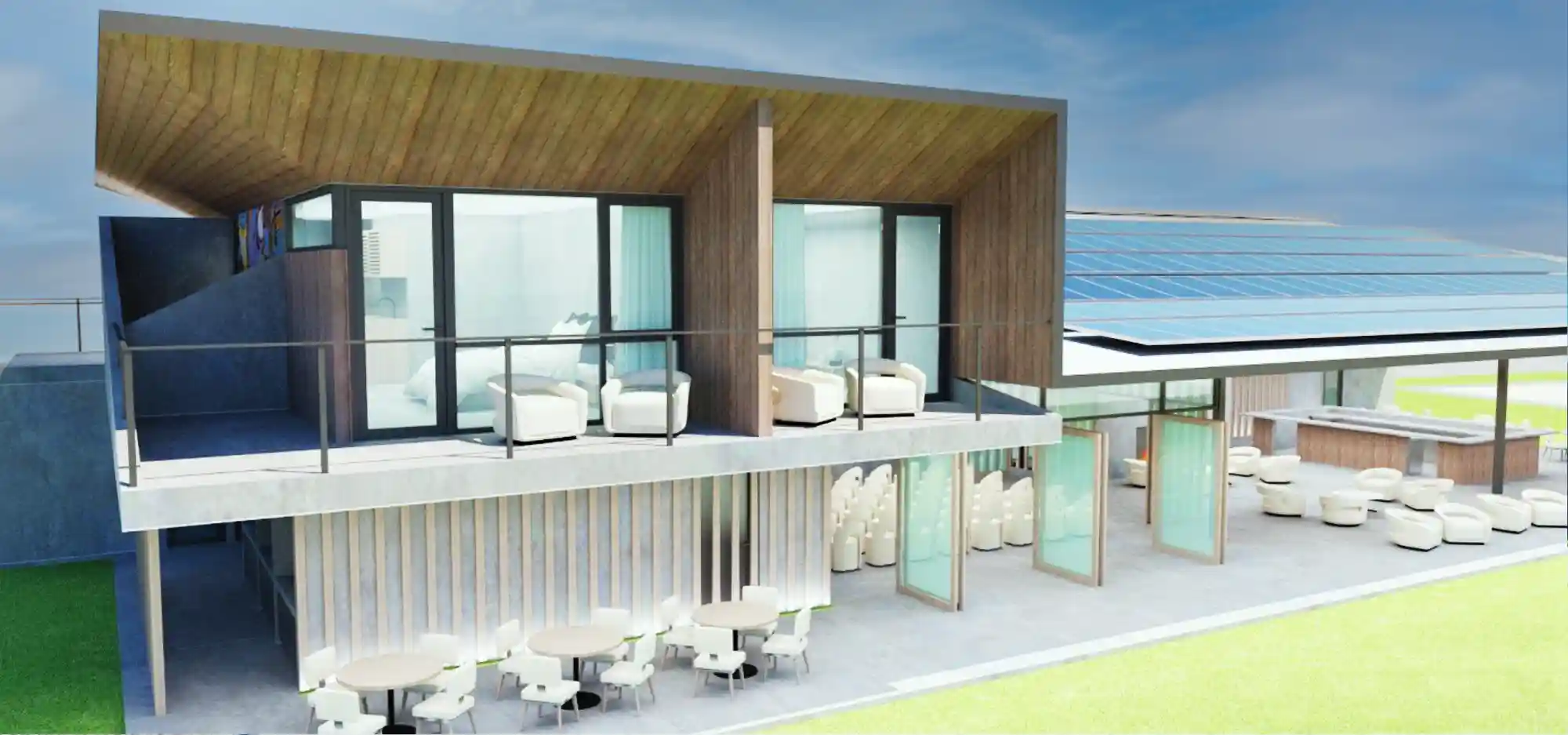 Inside the open-air layout, a series of flexible communal spaces are arranged to encourage connection, relaxation, and immersion in the natural setting. Guests can gather at the bar for a refreshing drink, participate in shared cooking or dining experiences, or lounge in airy meeting spaces that frame views of the valley and surrounding forest. The pavilion’s openness mirrors the resort’s emphasis on exploration and leisure—serving as a central hub from which guests embark on activities such as kayaking on the lake, exploring nature trails, enjoying beach paddle courts, or setting out on RV adventures.