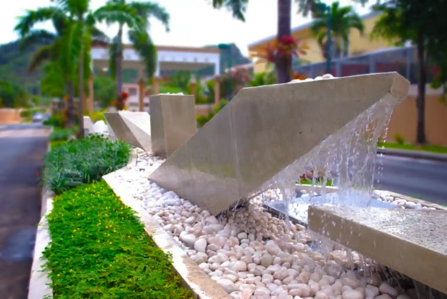 What sets the fountain apart is the way it integrates seamlessly with its surrounding landscape. Lush tropical plants weave between the angular slabs, softening the stark concrete and grounding the design in its tropicaln setting. The effect is both modern and organic—a masterful balance between human craftsmanship and natural beauty. By day, sunlight catches the textured surfaces and rippling water, creating a play of reflections and shadows; by night, subtle lighting transforms the structure into a glowing landmark. The fountain stands not merely as decoration, but as an emblem of the neighborhood’s sophistication and its embrace of contemporary design.