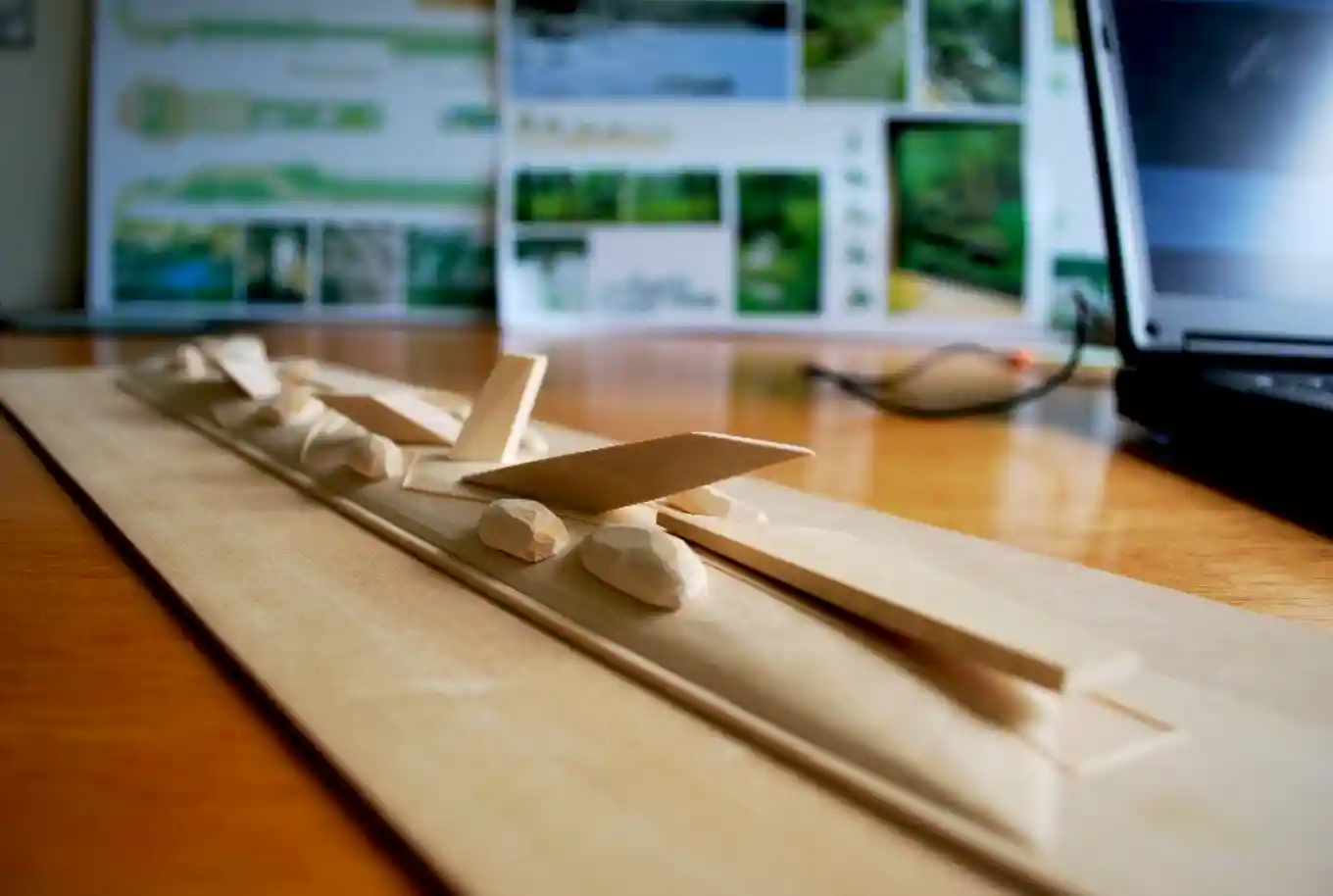 A long, sculptural fountain with jutting concrete shards at dynamic angles jutting from the ground. The interplay of sharp geometry and flowing water gives the piece a sense of movement and vitality, as though nature and architecture are locked in a harmonious dance. Overflowing basins are arranged at varying levels, allowing the water to cascade rhythmically from one to the next to both sooth and energize visitors as they enter the community.