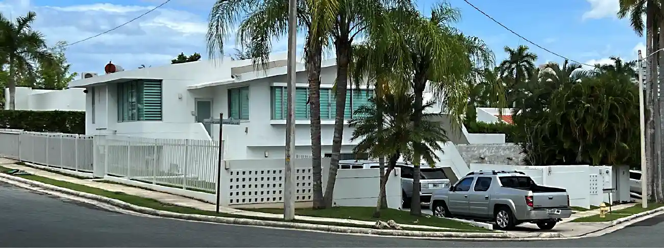 The residence in Garden Hills, Guaynabo stands as a striking example of contemporary Caribbean architecture, balancing bold modernism with a welcoming sense of openness. Its two-story design stretches across a notably wide footprint, embracing the corner lot in a way that feels intentional and sculptural. Along the upper main living area, sweeping glass walls create a sense of transparency and connection to the outdoors, allowing natural light to flood the interior throughout the day. Beneath this elevated glass-lined space lies an open carport, giving the structure a floating, almost weightless appearance while maintaining functionality and ease of access.