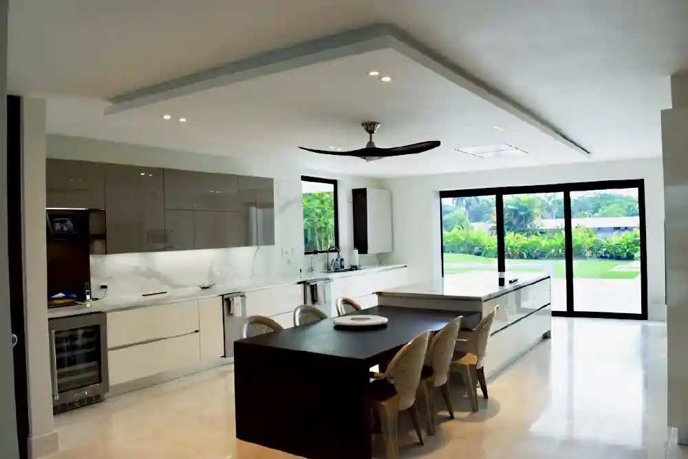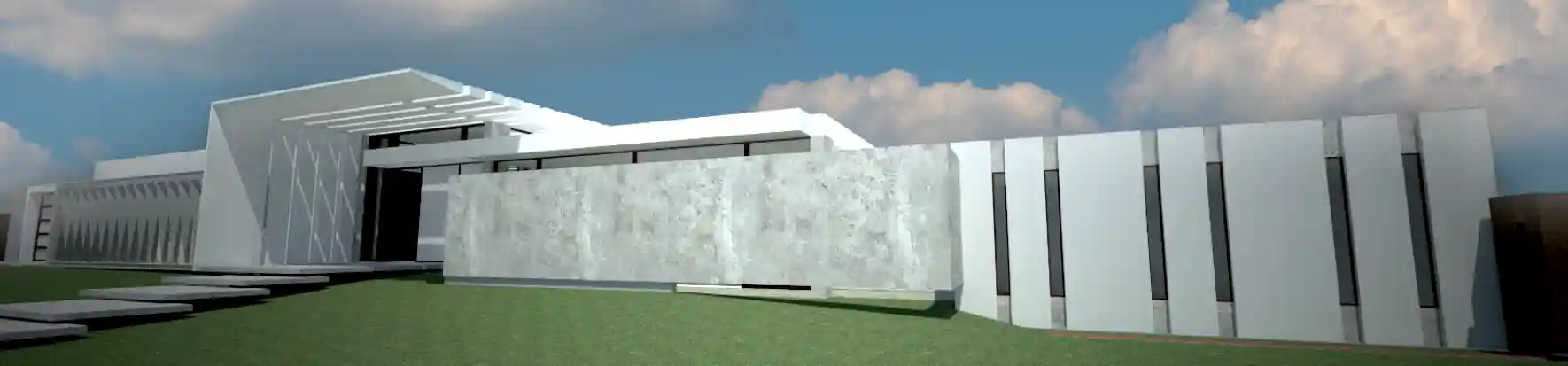 The project focuses on the renovation of an existing residence and the addition of new spaces, including a main entrance, entertainment lounge, terraces, and garages. An exposed concrete wall and metal screen on each wing of the house create two interior courtyards, enhancing privacy while allowing for natural ventilation. Variations in ceiling heights, as well as the depth of walls and windows, help articulate the façade’s distinctive horizontality. The main entrance is defined by a generous cantilevered overhang that welcomes visitors and extends from the reception area to the pergola-covered terrace, framing a panoramic view of the rear courtyard.