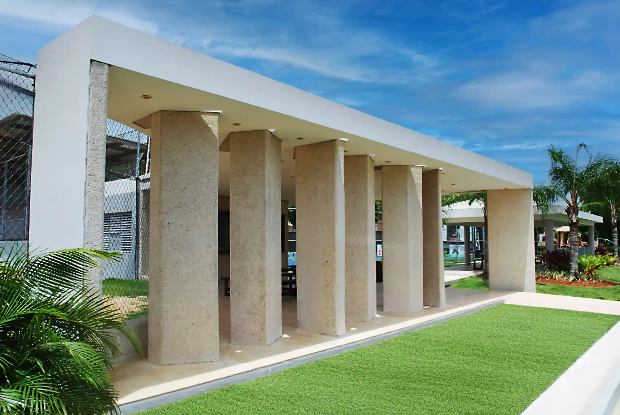 The open-air community center at Monte Claro is conceived as both a welcoming gateway and a social heart for the neighborhood’s recreational grounds. Its architectural language is unmistakably modern: clean lines, honest materials, and deliberate openness. A flat concrete roof appears to float above the gathering space, its weight carried by the center’s signature feature—seven asymmetric columns of exposed concrete. These columns stand in close proximity, each angled in its own direction, creating a sculptural rhythm that feels active and alive, much like the community it serves.